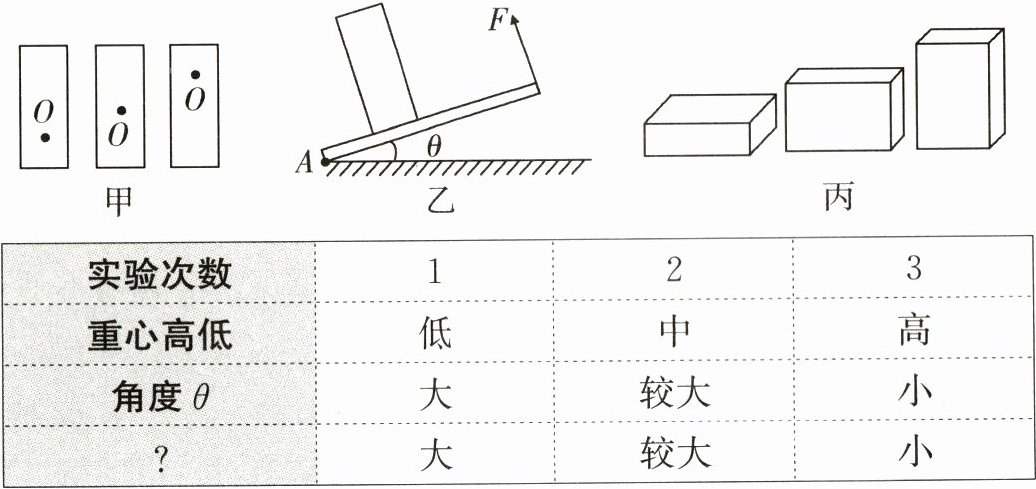 22.[质疑创新](15分)(2024·贵阳云岩一模)小明发现电风扇、落地灯等都有个大而重 的底座,使它们更稳定,不易翻倒。经查阅:支撑面上物体 的稳定程度叫作稳度。他思考:物体 的稳度跟什么因素有关呢?为了弄清这个问题,他提出猜想:猜想1:物体 的稳度可能与物体重心 的高低有关;猜想2:物体 的稳度可能与物体支撑面 的大小有关。为了验证猜想1,他将三块完全相同 的橡皮泥分别固定在三个完全相同 的长方体 的底部、中部和顶部(其重心位置如图甲所示),分别将它们放在表面粗糙 的水平木板上,让木板在力F 的作用下绕A点转动,通过观察长方体刚好翻倒时(物体始终不发生滑动),木板转过 的角度θ 的大小来比较物体稳度 的大小(如图乙所示),实验记录如下表.