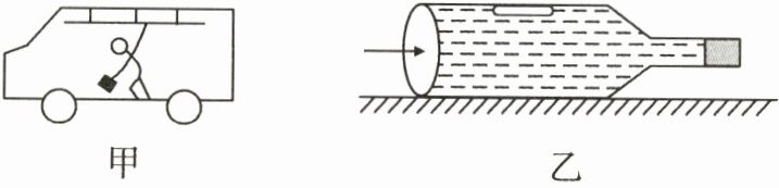 13. 如图甲所示,水平公路上向前行驶的汽车中,一竖直站立的人突然向前倾,此时汽车突然________(选填“加速”或“减速”);如图乙所示,桌上放一个装满水的瓶子,中间有一个气泡,用手向右推一下瓶子,气泡将向________(选填“左”或“右”)运动.