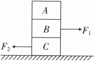 0 2 1 [解析]以A为研究对象,由于A、B没有相对运动的趋势,故A和B间的摩擦力$f_1 = 0\ N$,以AB整体为研究对象,由力的平衡分析可知,C对B的摩擦力与$F_1$大小相等,方向相反,即B和C间的摩擦力$f_2 = F_1 =2\ N$;以三个物体整体为研究对象,根据力的平衡分析可知,桌面对C的摩擦力$f_3$与$F_1、F_2$的合力大小相等,方向相反,即$f_3 = F_2 - F_1 = 3\ N - 2\ N = 1\ N$,方向水平向右,由于力的作用是相互的,C对桌面的摩擦力大小为$1\ N$,方向水平向左.