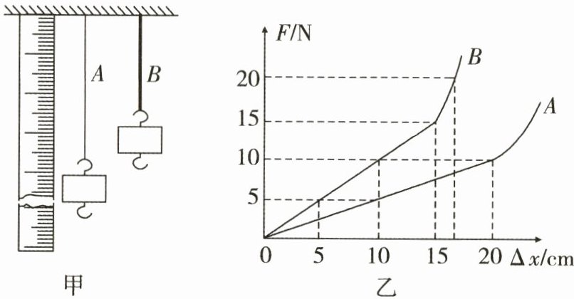 (1)由图乙可知,B橡皮筋在受到的拉力不大于$15\ N$的情况下,橡皮筋受到的拉力大小F与橡皮筋的伸长量$\Delta x$变化关系为一条直线,说明橡皮筋受到的拉力F与橡皮筋的伸长量$\Delta x$成正比例函数的关系,即$F_B = k_B\Delta x_B$,当$F_B = 10\ N$时,$\Delta x_B = 10\ cm$,将上面的数据分别代入$F_B = k_B\Delta x_B$,得$k_B= 1\ N/cm$,所以当在两根橡皮筋上悬挂重力为$6\ N$的物体时,B橡皮筋的伸长量$\Delta x_B'=\frac{6\ N}{1\ N/cm}=6\ cm$.