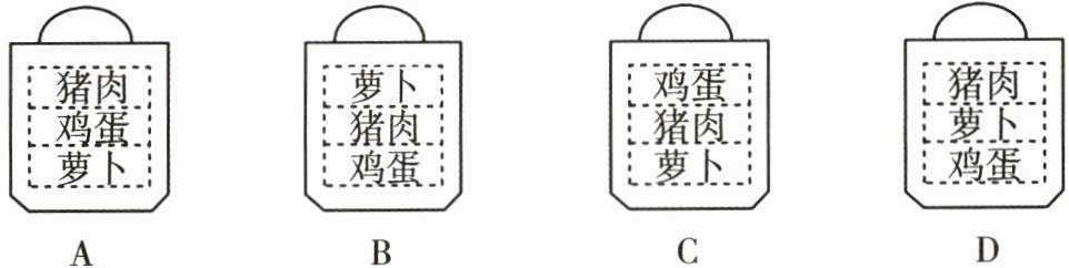 2. 日常生活(2024·淮安期末)小刚在超市买了1 000 g猪肉、1 000 g萝卜、500 g散装鸡蛋,各用保鲜袋装好后,他想把三样物品放在环保袋中提回家. 根据压强知识与生活实际,下列装袋方式最合理的是( )