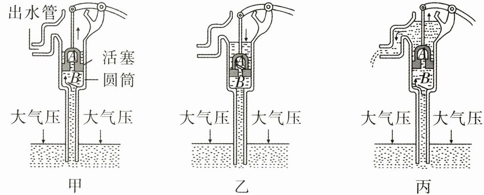 14. 科技应用(2024·洛阳孟津期末)抽水机也叫水泵,如图甲、乙、丙是活塞式抽水机工作原理的示意图. 抽水机是利用________来工作的;在标准大气压下,活塞式抽水机最多可把水抽到的高度约为________ m(保留一位小数);活塞式抽水机在工作前,需向圆筒内灌入几杯水,这样做的目的是_________________.