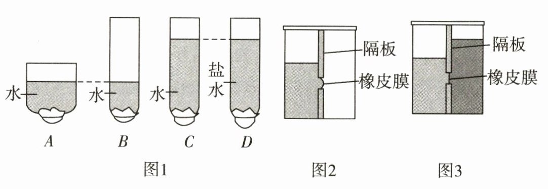 (5)实验后,该同学自制如图2所示装置继续探究,已知隔板在容器的中央,他向隔板左侧倒水,发现橡皮膜向右侧凸起,这说明液体对容器_______(选填“底部”或“侧壁”)有压强。他再向隔板右侧倒入另一种液体,当加到一定程度时,橡皮膜恢复原状,如图3所示,则此液体的密度_______(选填“大于”“等于”或“小于”)水的密度。