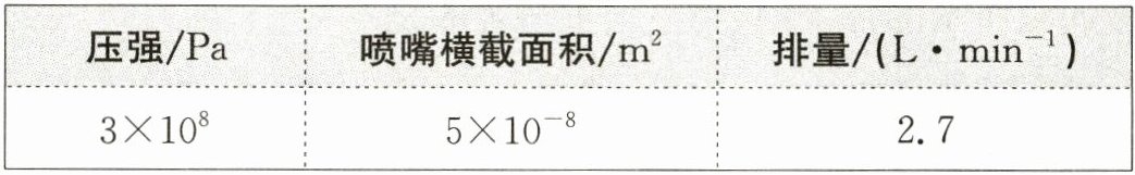 ②由“排量2.7 L/min”可知,每分从喷嘴中喷出水的体积$V = 2.7 L = 2.7 dm³ = 2.7×10^{-3}$ m³,每分喷出水流的长度$L=\frac{V}{S}=\frac{2.7×10^{-3} m³}{5×10^{-8} m²}=5.4×10^{4}$ m,高压水从喷嘴喷出时的速度$v=\frac{L}{t}=\frac{5.4×10^{4} m}{60 s}=900 m/s$。