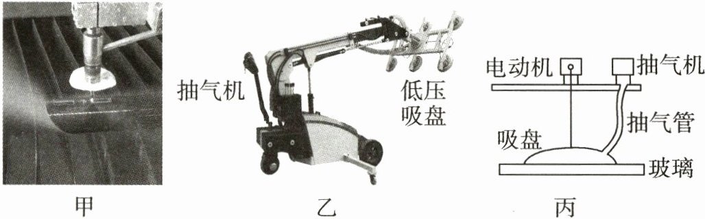 (2)玻璃加工厂常用如图乙所示低压吸盘吊车吊运玻璃。先将6个吸盘压在玻璃上,然后启动抽气机抽出吸盘内空气使吸盘内气压减小,在大气压作用下吸盘将玻璃“吸住”,再将玻璃吊起。图丙为低压吸盘吊车结构示意图。每个吸盘质量为5 kg,面积为75 cm²,6个吸盘内气压相同。有一块面积为2 m²、质量为90 kg水平放置玻璃,当大气压为1 .0×10⁵ Pa时,吸盘内气压至少要达到多少才能把玻璃“吸”起? ($g$取10 N/kg)