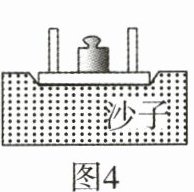 (4)图3中桌面对海绵的压强为$p_{1}$,小航将图3中的小桌、砝码平放在表面平整的沙子上,静止时如图4所示,桌面对沙子的压强为$p_{2}$,则$p_{1}$________$p_{2}$(选填“<”“=”或“>”).