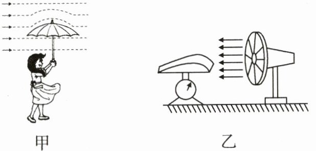 4. (2024·惠州惠东期末)如图甲所示,放学途中,小媛撑着雨伞在雨中行走. 一阵大风吹来,伞面被吹翻. 她猜想伞面受到升力的大小可能与空气的________有关.