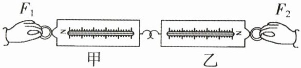 3. 如图所示,甲、乙两个弹簧测力计放在水平面上并相互钩在一起,用水平拉力 $F_1$ 和 $F_2$ 分别拉开,$F_1 = F_2 = 5N$,两弹簧测力计静止时,下列分析正确的是( )