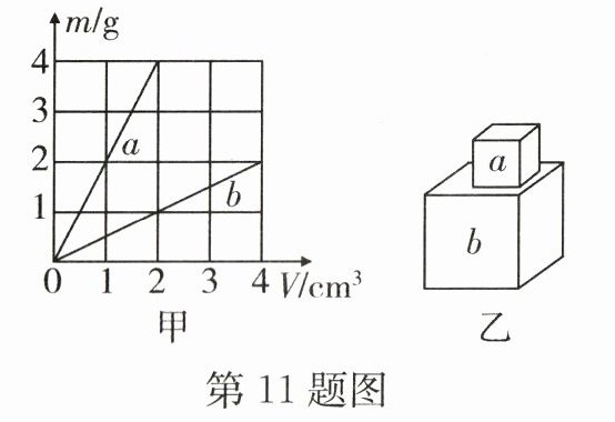 11. 图甲是 $a$、$b$两种物质的质量与体积的关系图像,分别用 $a$、$b$两种物质制成的两个实心正方体的边长之比为1∶2.将它们按图乙方式叠放在水平地面上时,$a$对 $b$ 的压强和 $b$对地面的压强之比为( )