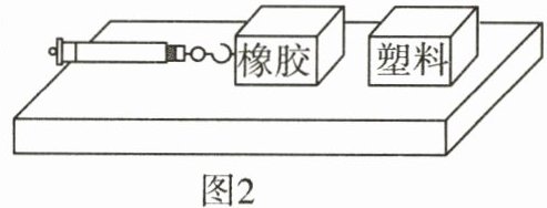 (3)该组同学又探究了不同材质的鞋底对拔河比赛的影响。设计方案如下:选用外形、体积完全相同的实心橡胶块和塑料块(如图2),用弹簧测力计拉着橡胶块在水平长木板上做匀速直线运动,测出它与该长木板间的滑动摩擦力;用同样的方法测塑料块与长木板之间的滑动摩擦力;重复上述实验三次;比较实验数据得出结论。请指出此设计方案存在的问题:______________________;在不改变器材的情况下提出改进方案:______________________________.