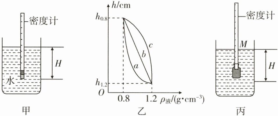 ②将它放入密度为0.8~1.2 g/cm³ 的不同液体中,浸入的深度h与液体密度ρ液之间的关系应符合图乙中_______(选填“a”“b”或“c”).