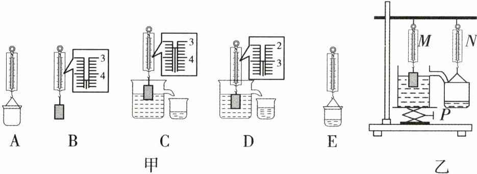 (4)如图乙所示,小张将装满水的溢水杯放在升降台P上,用升降台调节溢水杯的高度.当小明逐渐调高升降台,发现随着圆柱体浸入水中的体积越来越大,弹簧测力计M的示数_______(选填“增大”“减小”或“不变”).当圆柱体浸没时弹簧测力计M的示数变化量为ΔF<sub>M</sub>,弹簧测力计N的示数变化量为ΔF<sub>N</sub>,它们的大小关系是ΔF<sub>M</sub> _______ ΔF<sub>N</sub>(选填“>”“=”或“<”),从而可以证明F<sub>浮</sub> = G<sub>排</sub>.