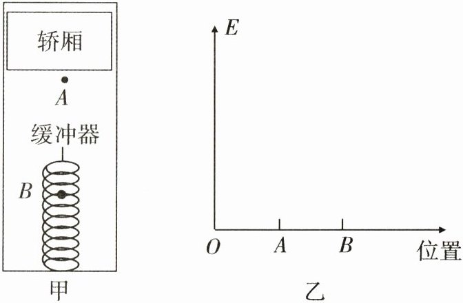 19. 安全教育(3分)(2024·贵阳修文一模)随着人们安全意识的提高,电梯安全越来越受到人们的关注,其中一项安全措施是在电梯井内轿厢正下方的地面上安装缓冲装置(如图甲所示,该装置为若干组弹簧构成)能有效减缓冲击,从而防止电梯加速下坠时发生安全事故.测试员在对该电梯缓冲装置安全性进行测试时要模拟电梯轿厢在运行过程中突然加速下坠,当轿厢接触缓冲装置并压缩弹簧后最终停下来.请你在图乙中画出轿厢匀速下降经过A点时发生故障突然加速下坠,接触并压缩缓冲器后最终安全停在缓冲器上的B点这一过程中,轿厢的动能E与位置的大致关系图像.