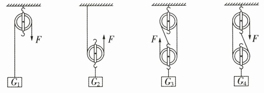 3. 如图所示,人对绳的拉力都是F,将各重物匀速提起.不计动滑轮重和摩擦,物重最大的是 ( )