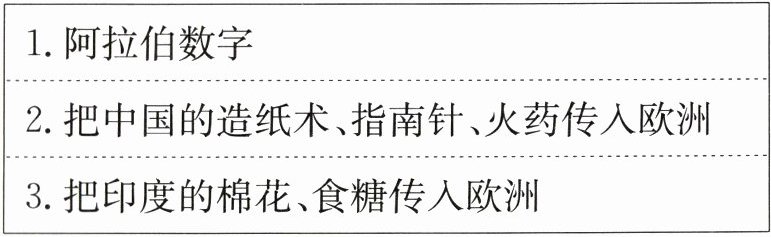 D [解析]结合所学知识可知,阿拉伯人改造了古印度人从0到9的计数法,形成了我们现在使用的“阿拉伯数字”;同时,阿拉伯人把中国的造纸术、指南针、火药等重大发明和印度的棉花、食糖等传入欧洲。这些史实充分说明阿拉伯人促进了东西方文化交流。故选D。