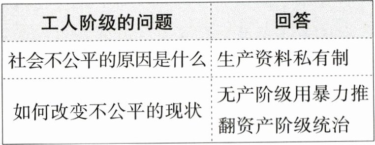 D [解析]根据所学知识解读表格,从“无产阶级用暴力推翻资产阶级统治”可知,这是《共产党宣言》中为无产阶级指出的实现自身解放的道路。故选D。