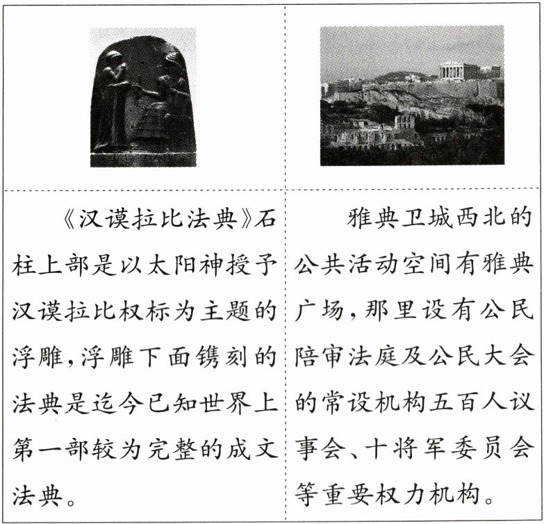 (2)观点:赞同。理由:罗马共和国颁布了《十二铜表法》,用成文法来处理社会中遇到的种种问题和案件,使定罪量刑有了文字依据,在一定程度上遏制了贵族对法律的曲解和滥用,所以说,罗马是一个法治的社会(或:观点:不赞同。理由:罗马共和国虽然颁布了《十二铜表法》,但其本质是维护统治阶级利益,平民还是很难享受到民主与法治)。