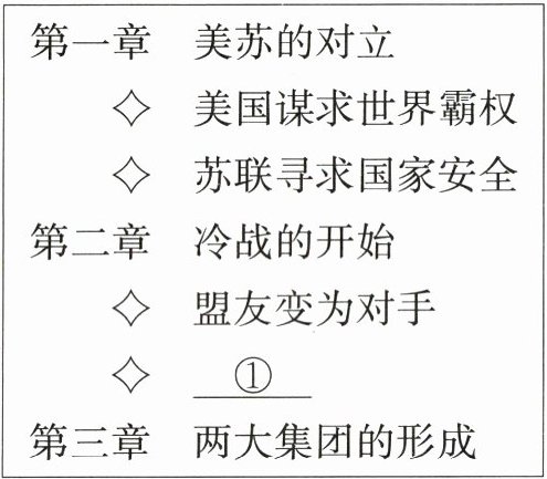 A [解析]根据题干“冷战的开始”“盟友变为对手”并结合所学知识可知,1947年杜鲁门主义的提出,标志着美、苏战时同盟关系正式破裂,冷战开始,因此①处对应杜鲁门主义的出台。故选A。