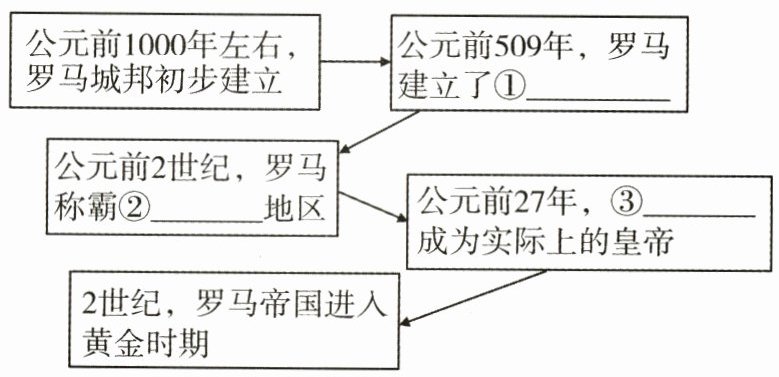 (1)①共和国 ②地中海 ③屋大维 (2)变化:由共和制转变为帝制。 原因:版图不断扩张、大规模的内战和军事独裁的出现,导致共和国解体,帝国形成。(3)时间:2世纪。 (4)原因:庞大的开支和贪污盛行,政府滥发货币;统治集团内部纷争激烈,帝位更迭频繁;“蛮族”侵袭。
