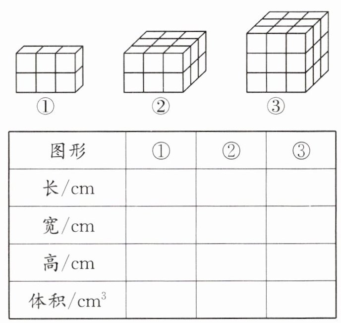 一、下面每个小正方体的棱长都是1 cm,仔细观察图形并填写下表。
