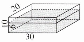 3. 一个长方体容器(如图),长30 cm、宽20 cm、高10 cm,里面的水深6 cm。如果把这个容器盖紧,再朝左竖起来,里面的水深多少厘米?