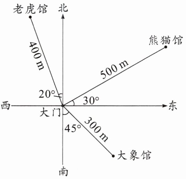 3. 大象馆在大门的( )偏( )( )°方向上;大门在大象馆的( )偏( )( )°方向上,距离大象馆( )m。