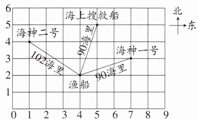 1. 东 北 19 2. 海神一号用时:90÷30 = 3(时) 海神二号用时:102÷34 = 3(时) 海上搜救船:90÷45 = 2(时) 海上搜救船先到。