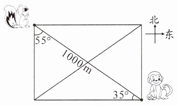 小猴家在松鼠家南偏东55°方向上,相距1000 m。