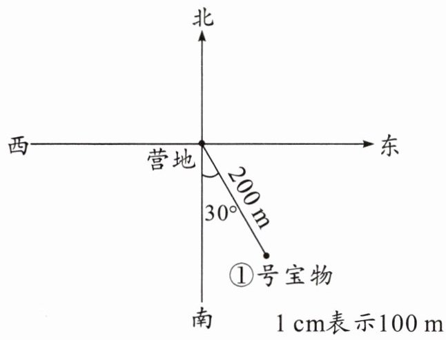 ②号宝物在营地北偏东45°的方向上,距离营地150 m;
