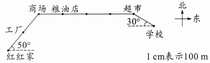 1. 红红从家往东偏北50°方向走200 m到达商场,再往东走400 m到达超市,最后往东偏南30°方向走100 m到达学校。