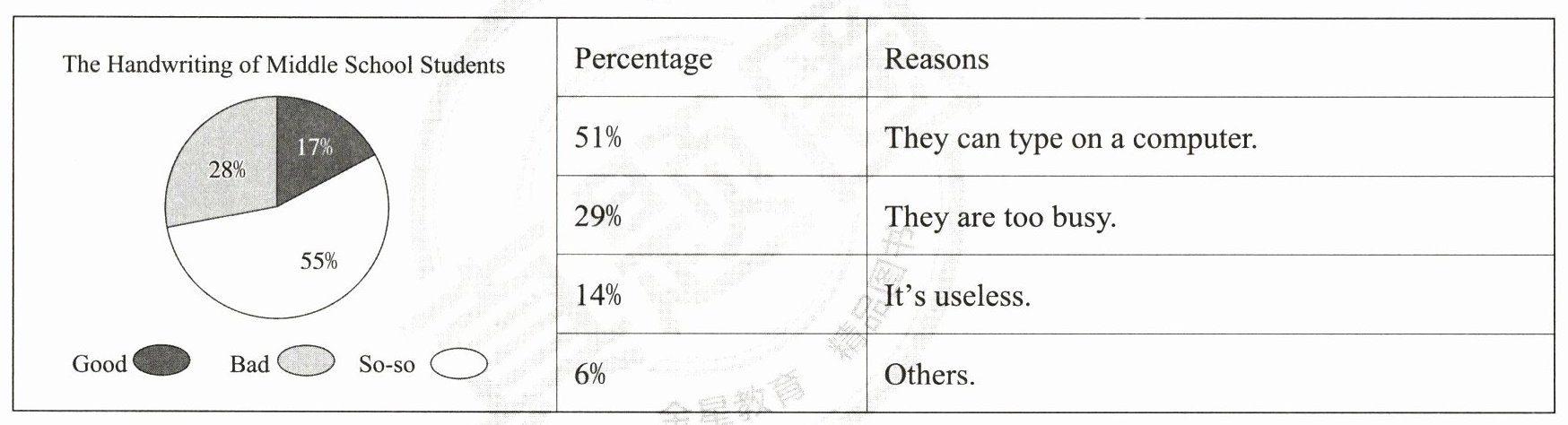 中考新形式调查报告Nowadays,people depend too much on their computers.It seems that the computer has become a very important tool to help people to write.As a result,many people have forgotten how to write Chinese characters.What's worse,students are paying less attention to it.Recently,researchers did a survey in a middle school.1,000 students took part in it.According to the survey,over half of the students have poor handwriting.