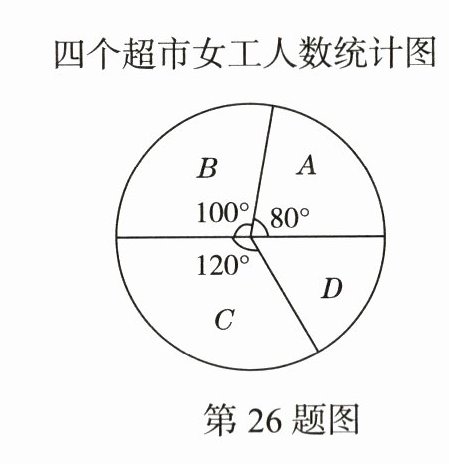 26.(10分)小明对A,B,C,D四个中小型超市的女工人数进行了统计,并绘制了下面的统计图表,已知A超市有女工20人.