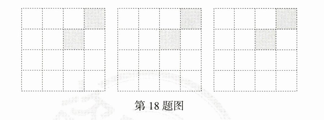 18. 开放性问题(5分)如图是由16个正方形组成的网格图,现已将其中的两个涂色,请你用三种不同的方法分别在下图中再给三个空白的小正方形涂色,使它成为轴对称图形.