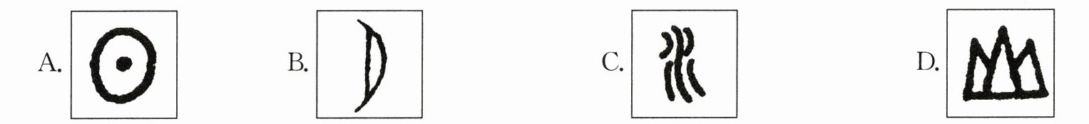 All the shapes on the stone walls came into his mind.Cang kept making all kinds of shapes on the ground.He paid attention to drawing.To show the Sun,for example he used a circle with a dot in the middle.A half−circle and a vertical line(垂直线)made up the Moon.And three lines that are not straight were used to show water.These symbols(符号)shone brightly in the snow.
