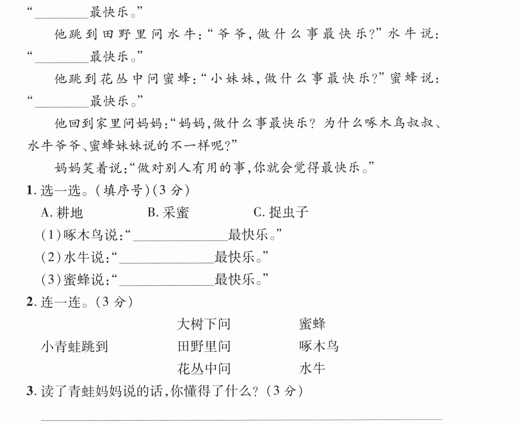 1.(1)C (2)A (3)B 2. 小青蛙跳到——大树下问——蜜蜂 |——田野里问——啄木鸟 |——花丛中问——水牛 3. 只要我们做对别人有用的事,就会很快乐。