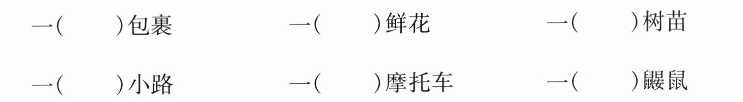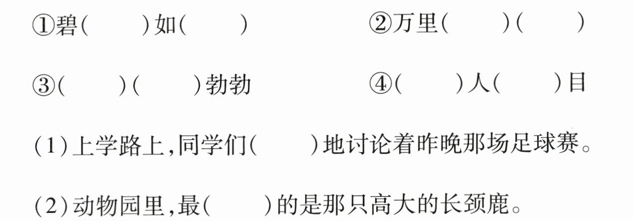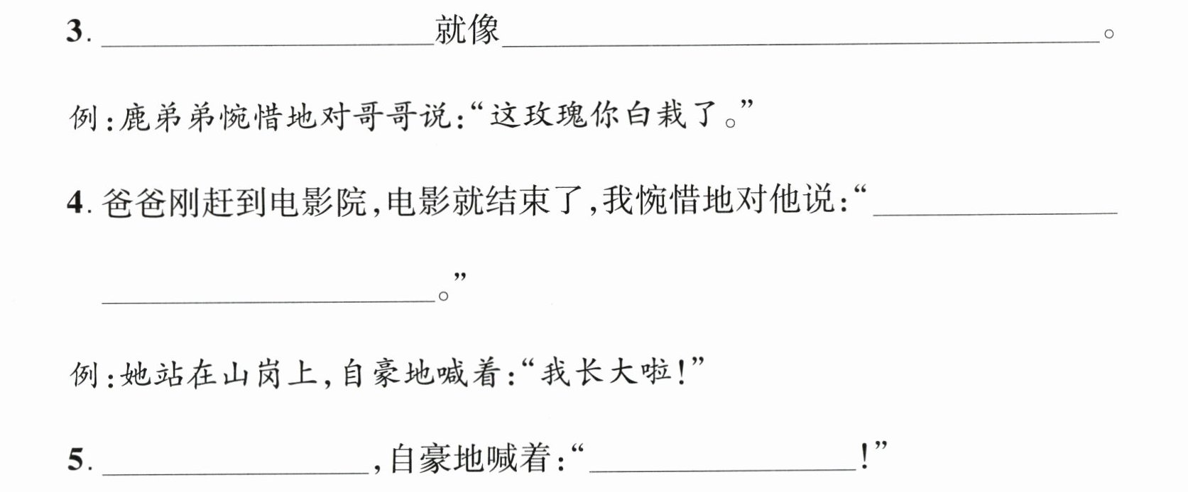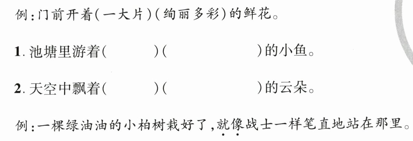 1. 一条条 自由自在 2. 一朵朵 形状不同 3. 蓝蓝的天空 大海一样蓝 4. 爸爸你白来了,电影演完了 5. 我站在大海边 我成功啦