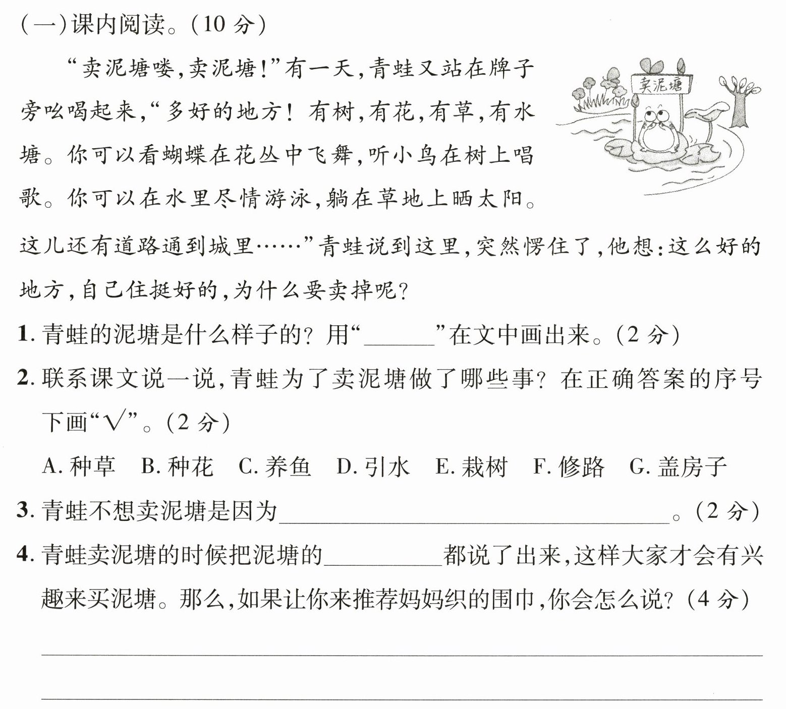 1. 有树,有花,有草,有水塘。你可以看蝴蝶在花丛中飞舞,听小鸟在树上唱歌。你可以在水里尽情游泳,躺在草地上晒太阳。这儿还有道路通到城里…… 2. A B D E F G 3. 觉得泥塘这么好,不需要卖掉,他想自己住 4. 优点 示例:这是我妈妈给我织的围巾,用的是最好的毛线,戴起来十分温暖。而且,围巾上有很多有趣的图案,特别好看,也特别适合我们这样的小学生。