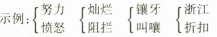 $\begin{cases}努( ) \\ 怒( ) \end{cases}$ $\begin{cases}烂( ) \\ 拦( ) \end{cases}$ $\begin{cases}镶( ) \\ 嚷( ) \end{cases}$ $\begin{cases}浙( ) \\ 折( ) \end{cases}$