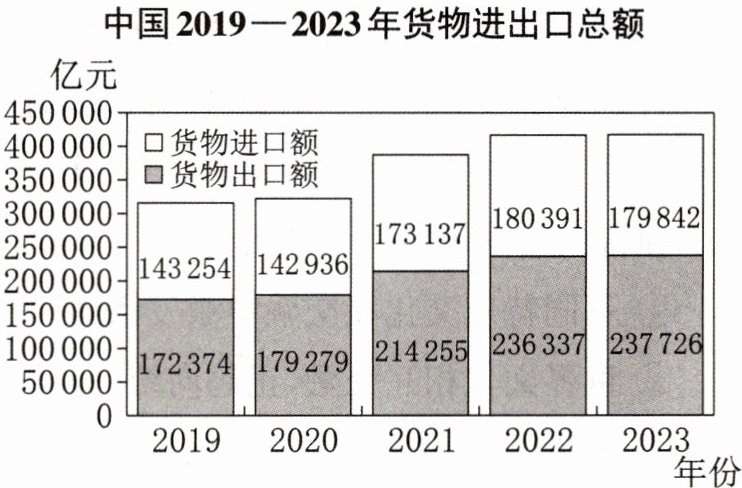 (1)① 2019年至2023年货物进出口总额的总体数值变化。② 2019年至2023年货物进口额的数值变化。③ 2019年至2023年货物出口额的数值变化。 (2)上图侧面反映了经济全球化中贸易全球化的表现。贸易全球化带来的影响包括:积极影响:促进了资源在全球范围内的优化配置,各国可以充分发挥自身的优势,提高生产效率;推动了国际贸易的发展,增加了消费者的选择,提高了生活水平;加强了各国经济之间的相互依存和联系,促进了国际分工的深化。消极影响:加剧了世界经济的不平衡,发达国家在贸易中往往占据优势地位,发展中国家可能面临贸易逆差和经济依赖;贸易保护主义有所抬头,对自由贸易和公平竞争构成威胁;可能导致一些国家的产业受到冲击,造成失业和经济不稳定。 (3)① 各民族文化共同构成姹紫嫣红、生机盎然的世界文化大花园。② 文化多样性是人类社会的基本特征,是世界文化充满活力的表现,也是人类文明进步的重要动力。③ 中华文化博大精深,源远流长,历久弥新,薪火相传。④ 中华文化做到了创造性转化、创新性发展。