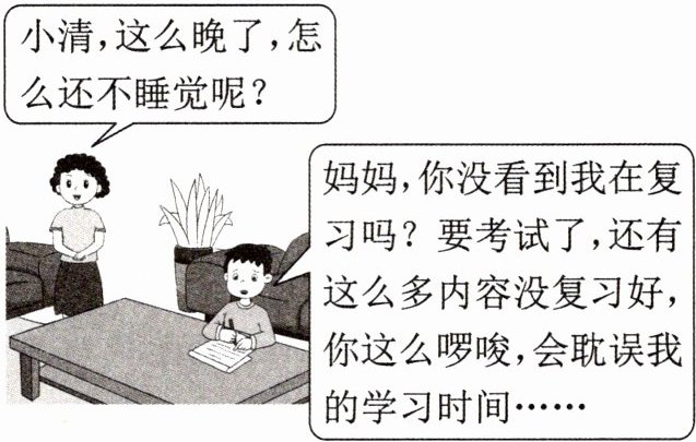 妈妈,你没看到我在复习吗?要考试了,还有这么多内容没复习好,你这么啰唆,会耽误我的学习时间……