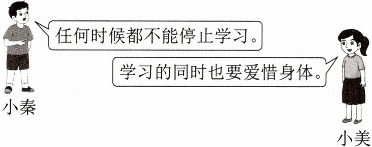 (1)示例一:选择小秦的观点。只有善于抓住和利用各种机会去学习,才能适应不断发展的社会;我们生活的时代信息量巨大,知识更新周期缩短,实践中的问题层出不穷,必须树立终身学习的观念。 示例二:选择小美的观点。生命是宝贵的,守护生命,我们才能追求人生的幸福;关心身体的状况,养成健康的生活方式,是一种对生命负责的态度。 (2)有助于弘扬中华优秀传统文化,培育社会主义核心价值观;有助于在实践中,锤炼自己,丰富人生经历,完善自我,提升自身素质;有助于增强问题意识,培养研究能力,努力做到知行合一;有助于养成主动学习、不断探索的习惯,增强自我更新、学以致用的能力。