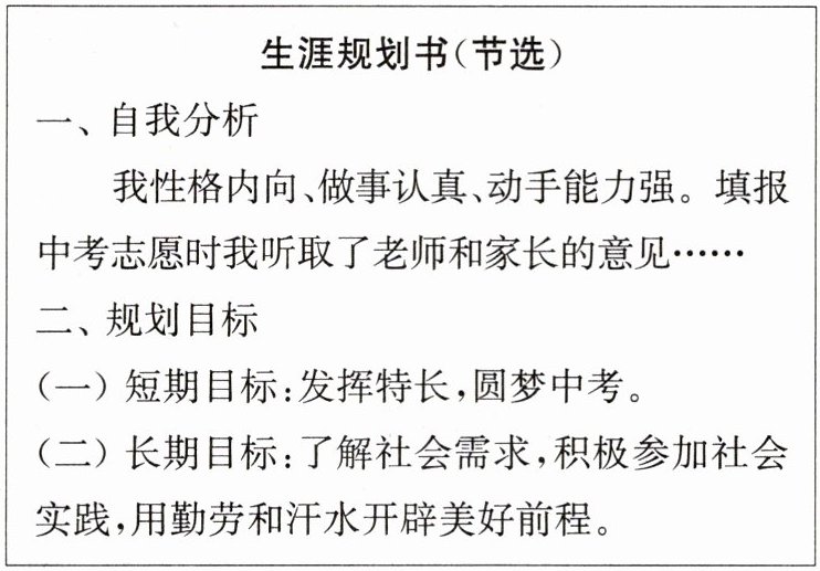 (二)长期目标:了解社会需求,积极参加社会实践,用勤劳和汗水开辟美好前程。|
