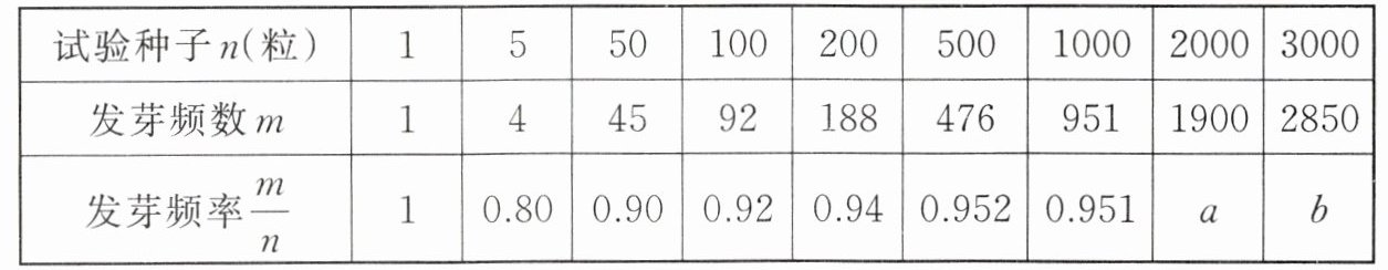 (2)观察发现:随着大量重复试验,发芽频率逐渐稳定在常数0.95附近,所以该麦种的发芽概率约为0.95。