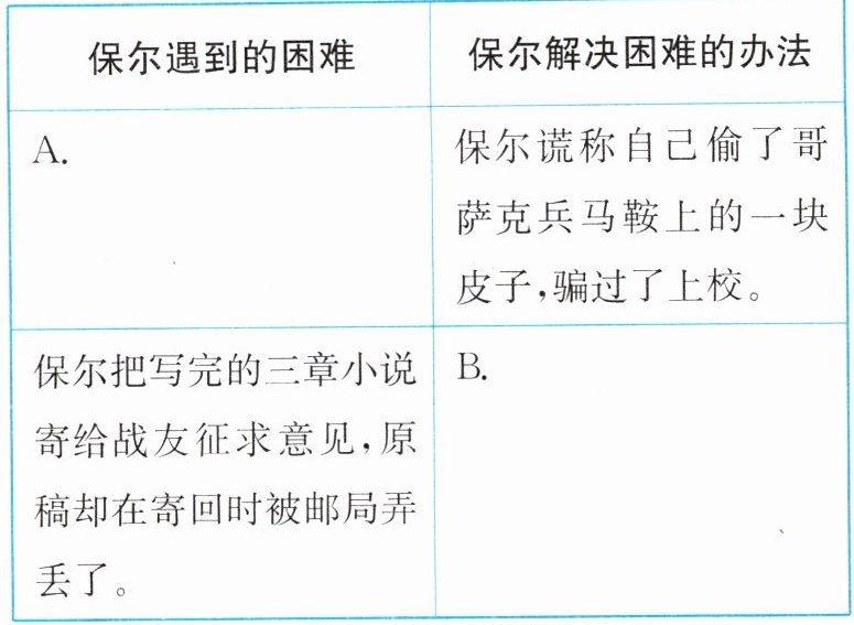8. 《钢铁是怎样炼成的》的作者在解释书名时说:“钢是在烈火与骤冷中铸造而成的,只有这样它才能变得坚硬。我们这一代人也是在这样的斗争中、在艰苦的考验中锻炼出来的,并且学会了在生活面前不颓废。”小说主人公保尔就是这样。请根据小说内容完成下面的表格。
