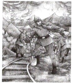 (1)图中保尔在工地上挥汗如雨。这张插图生动地展现了保尔不屈不挠、勤劳奋斗的精神风貌。他手中的工具,犹如他坚定的信念,砸向生活的重重困难,展现了一个真正的钢铁战士的形象。