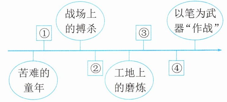 7. 下面是某同学阅读《钢铁是怎样炼成的》一书时,整理的主人公保尔·柯察金的成长史。请将下列各阶段的标志性事件填写在思维导图的相应位置,正确的顺序:① 解救朱赫来,② ______,③ ______,④ 打消“自杀”念头。(填字母)