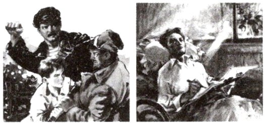 (2)左图:勇救朱赫来。朱赫来被白匪军抓走了,在匪兵押送朱赫来的途中,保尔猛扑过去,与朱赫来一起与押送兵搏斗,最后逃走了。由于维克多的告密,保尔被抓进了监狱。 右图:病魔将保尔束缚在床榻上。保尔也曾一度产生过自杀的念头,但他很快从低谷中走了出来。这个双腿瘫痪、双目失明并且没有丝毫写作经验的人,开始了他充满英雄主义的事业——文学创作。
