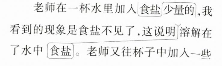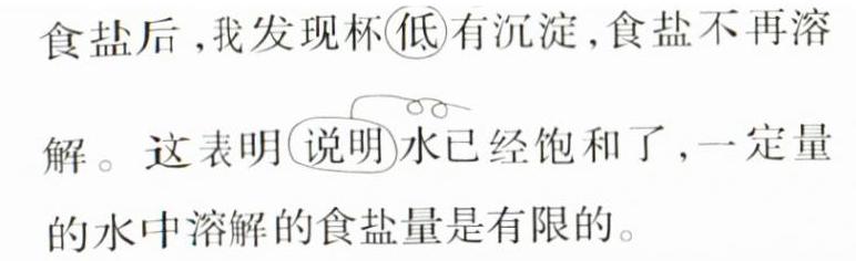 老师在一杯水里加入食盐少量的,我看到的现象是食盐不见了,这说明溶解在了水中食盐。老师又往杯子中加入一些食盐后,我发现杯低有沉淀,食盐不再溶解。这表明说明水已经饱和了,一定量的水中溶解的食盐量是有限的。