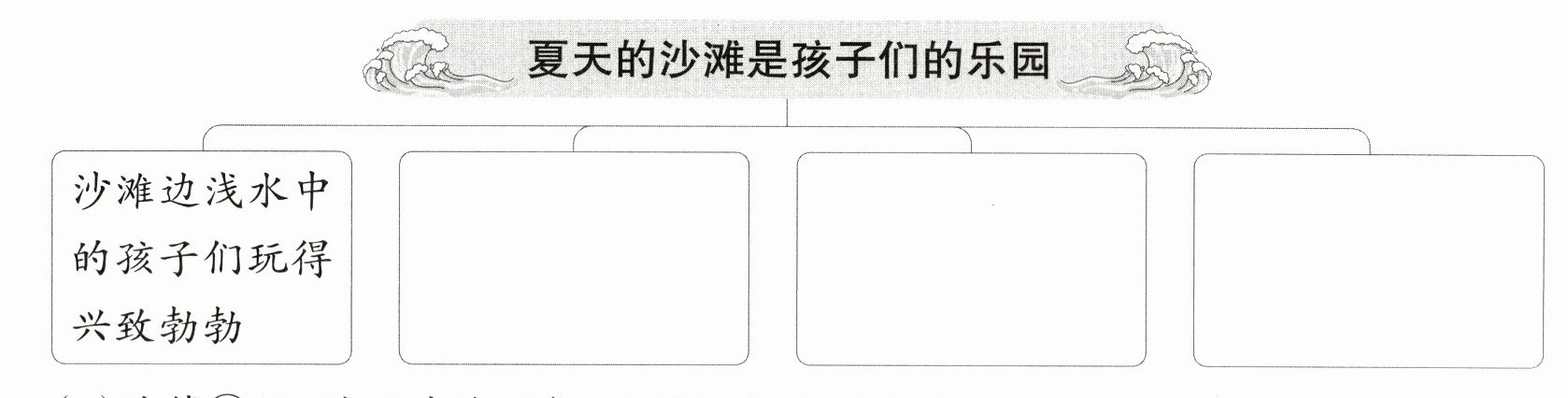 (2)[思维提升]第②段中,作者是从哪些方面把“夏天的沙滩是孩子们的乐园”写清楚的?把下面的思维导图补充完整。(3分)