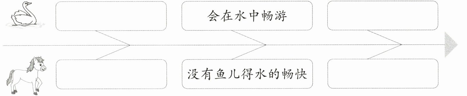 ②马抬起头,轻轻地哼了一声,说:“这的确是个事实,可惜不管在哪个领域,你都只是个‘三脚猫’而已。你会飞,可是你臃(yōng)肿的身躯使你的飞行沉重不堪,哪有云雀或燕子轻盈?你会游水,可是只能在水面划行,哪有鱼儿得水的畅快?你会走路,伸长个脖子,摇摆着蹼(pǔ)脚,‘咝咝’地叫唤,哪有猎豹走路时或缓或急的舒展?”